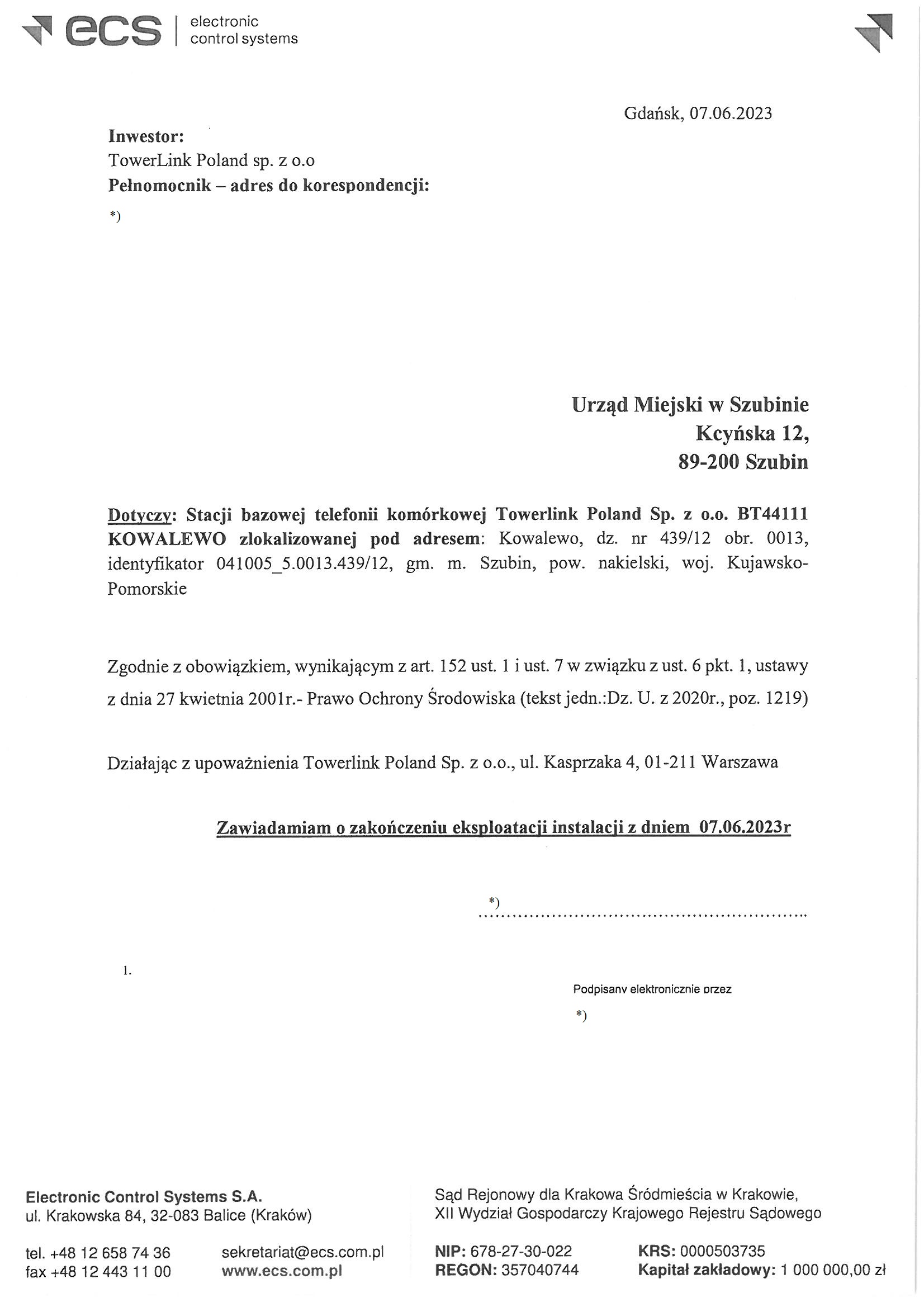 Zawiadomienie o zakończeniu eksploatacji instalacji nr BT44111 KOWALEWO, zlokalizowanej w m. Kowalewo, gm. Szubin, z dniem 07.06.2023 r.